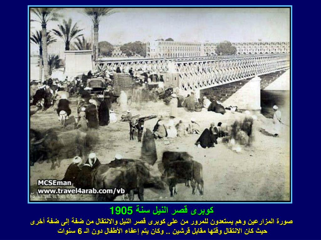 كوبرى قصر النيل سنة 1905 صورة المزارعين وهم يستعدون للمرور من على كوبرى قصر النيل والانتقال من ضفة إلى ضفة أخرىحيث كان الانتقال وقتها مقابل قرشين .. وكان يتم إعفاء الأطفال دون الـ 6 سنوات