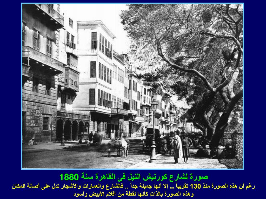 صورة لشارع كورنيش النيل فى القاهرة سنة 1880 رغم أن هذه الصورة منذ 130 تقريباً .. إلا أنها جميلة جداً .. فالشارع والعمارات والأشجار تدل على أصالة المكانوهذهالصورة بالذات كأنها لقطة من أفلام الأبيض وأسود