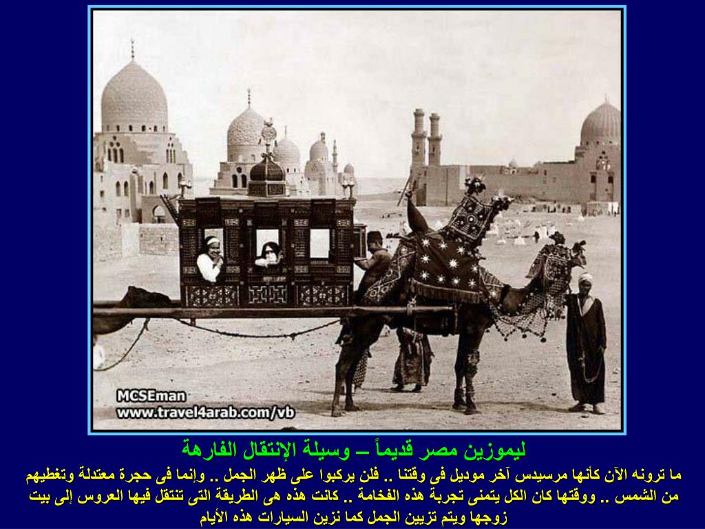 ليموزين مصر قديماً – وسيلة الإنتقال الفارهة ما ترونه الآن كأنها مرسيدس آخر موديل فى وقتنا .. فلن يركبوا على ظهر الجمل .. وإنما فى حجرة معتدلة وتغطيهم من الشمس .. ووقتها كان الكل يتمنى تجربة هذه الفخامة .. كانت هذه هى الطريقة التى تنتقل فيها العروس إلى بيت زوجها ويتم تزيين الجمل كما نزين السيارات هذه الأيام