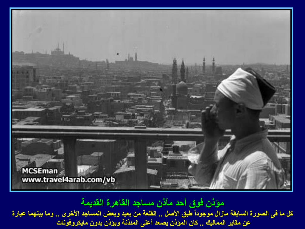 مؤذن فوق أحد مآذن مساجد القاهرة القديمة كل ما فى الصورة السابقة مازال موجوداً طبق الأصل .. القلعة من بعيد وبعض المساجد الأخرى .. وما بينهما عبارة عن مقابر المماليك .. كان المؤذن يصعد أعلى المئذنة ويؤذن بدون مايكروفونات