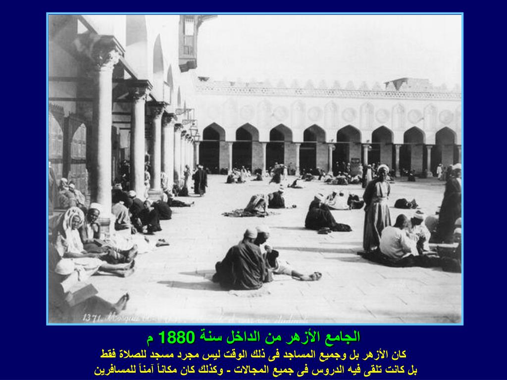 الجامع الأزهر من الداخل سنة 1880 م كان الأزهر بل وجميع المساجد فى ذلك الوقت ليس مجرد مسجد للصلاة فقط بل كانتتلقى فيه الدروس فى جميع المجالات - وكذلك كان مكاناً آمناً للمسافرين