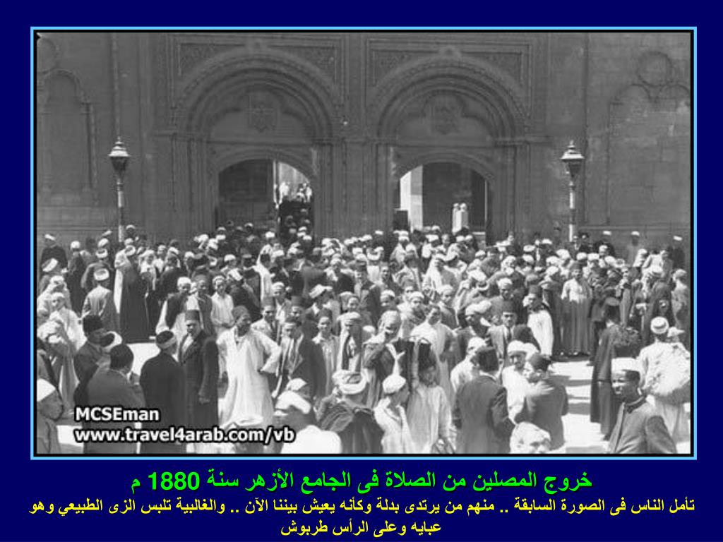 خروج المصلين من الصلاة فى الجامع الأزهر سنة 1880 م تأمل الناس فى الصورة السابقة .. منهم من يرتدى بدلة وكأنه يعيش بيننا الآن .. والغالبية تلبس الزى الطبيعي وهو عبايه وعلى الرأس طربوش