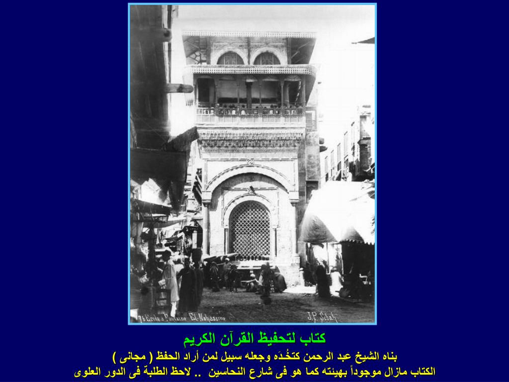 كتاب لتحفيظ القرآن الكريم بناه الشيخ عبد الرحمنكتخُـدَه وجعله سبيل لمن أراد الحفظ ( مجانى) الكتاب مازال موجوداً بهيئته كماهو فى شارع النحاسين .. لاحظ الطلبة فى الدور العلوى