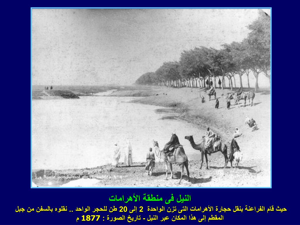 النيل فى منطقة الأهرامات حيث قام الفراعنة بنقل حجارةالأهرامات التى تزن الواحدة 2 إلى 20 طن للحجر الواحد .. نقلوه بالسفن من جبلالمقطم إلى هذا المكان عبر النيل - تاريخ الصورة : 1877 م