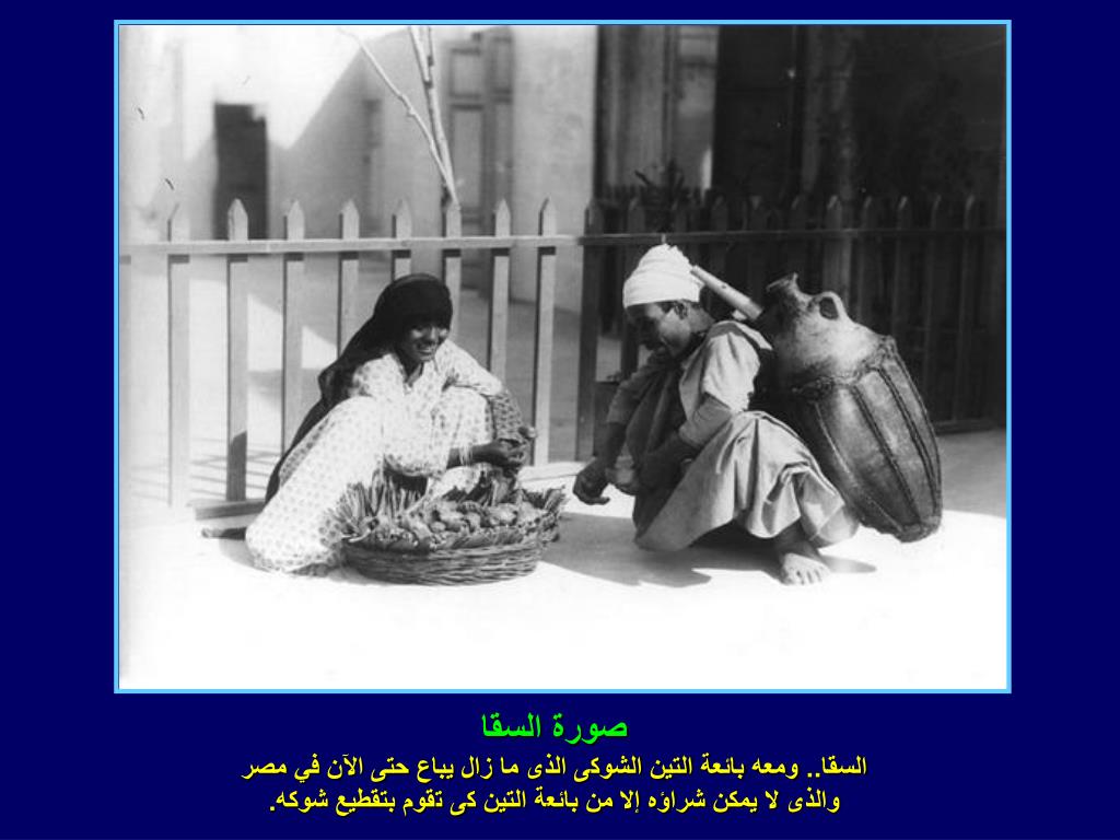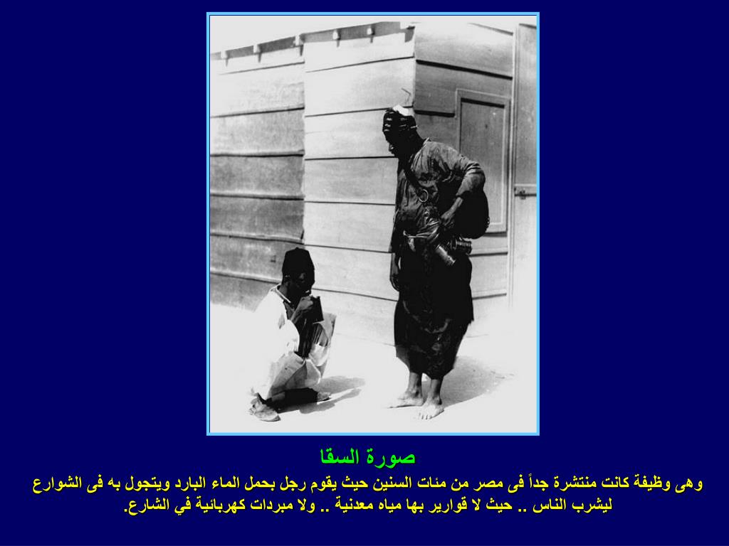 مصر منذ 150 عام. Egypt 150 Years Ago. الحلاق تاريخ الصورة : 1872 م. صورة السقا وه ى وظيفة كانت منتشرة جداً ف ى مصر من مئات السنين حيث يقوم رجل بحمل الماء البارد ويتجول به ف ى الشوارع ليشرب الناس .. حيث لا قوارير بها مياه معدنية .. ولا مبردات كهربائية في الشارع . صورة السقا