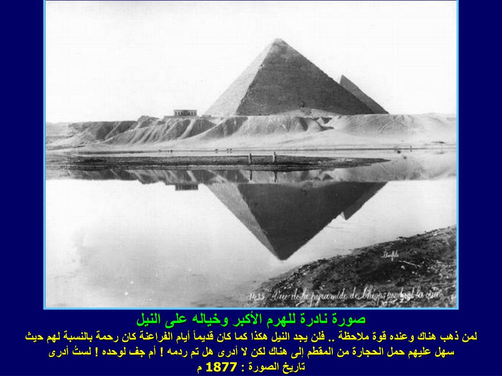 صورة نادرة للهرم الأكبر وخياله على النيل لمن ذهب هناك وعنده قوة ملاحظة .. فلن يجد النيل هكذا كما كان قديماًأيام الفراعنة كان رحمة بالنسبة لهم حيث سهل عليهم حمل الحجارة من المقطم إلى هناكلكن لا أدرى هل تم ردمه ! أم جف لوحده ! لستُ أدرى تاريخ الصورة : 1877 م