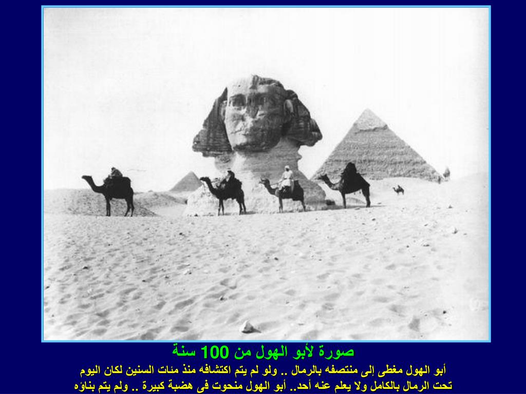صورة لأبو الهول من 100 سنة أبو الهول مغطى إلى منتصفه بالرمال .. ولو لم يتماكتشافه منذ مئات السنين لكان اليوم تحت الرمال بالكامل ولا يعلم عنه أحد.. أبوالهول منحوت فى هضبة كبيرة .. ولم يتم بناؤه