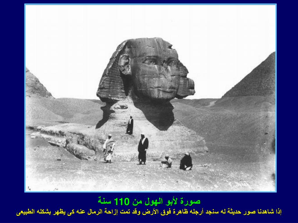 صورة لأبو الهول من 110 سنة إذا شاهدنا صور حديثة له سنجد أرجله ظاهرة فوق الأرض وقد تمت إزاحة الرمال عنه كى يظهر بشكله الطبيعى