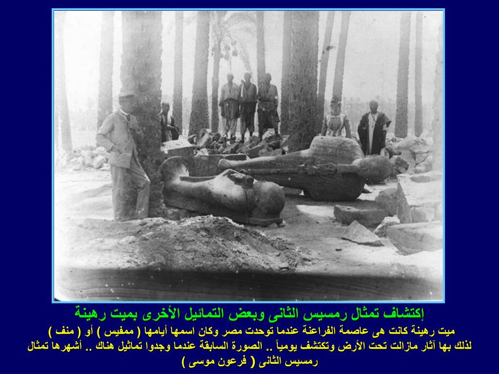 إكتشاف تمثال رمسيس الثانى وبعض التمائيل الأخرى بميت رهينة ميت رهينة كانت هى عاصمة الفراعنة عندما توحدت مصروكاناسمها أيامها ( ممفيس ) أو ( منف )لذلك بها آثار مازالت تحت الأرض وتكتشفيومياً .. الصورة السابقة عندما وجدوا تماثيل هناك .. أشهرها تمثال رمسيس الثانى ) فرعون موسى )