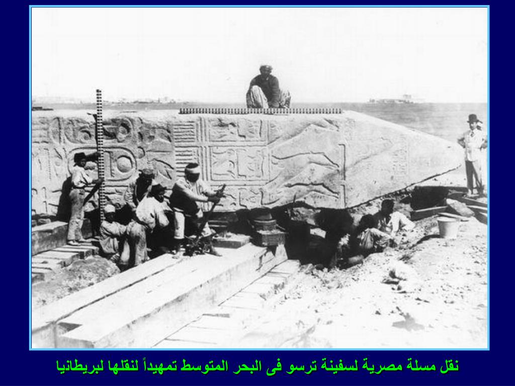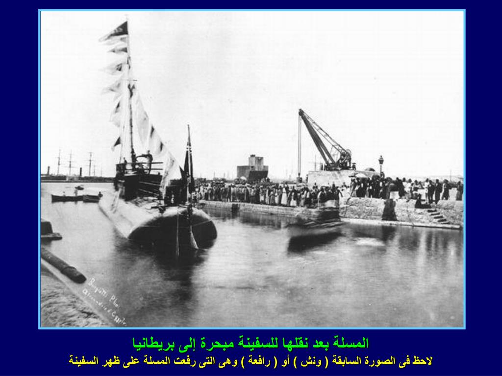 المسلة بعد نقلها للسفينة مبحرة إلى بريطانيا لاحظ فى الصورة السابقة ( ونش ) أو ( رافعة ) وهى التى رفعت المسلة على ظهرالسفينة