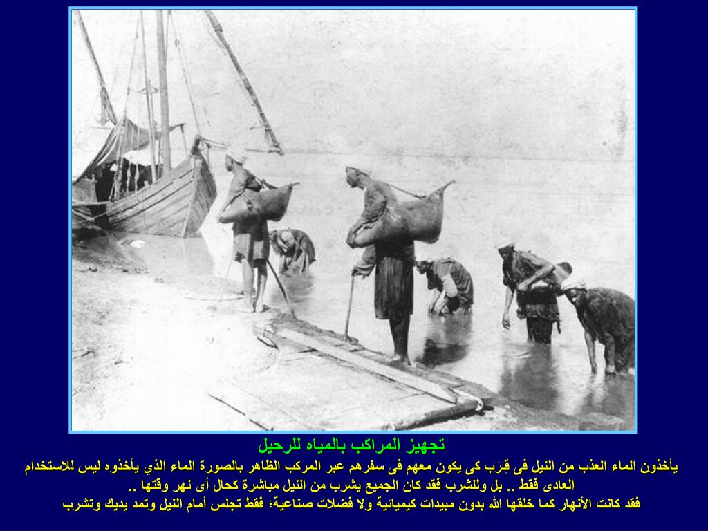 تجهيز المراكب بالمياه للرحيل يأخذون الماء العذب من النيل فى قِـرَب كى يكون معهم فى سفرهم عبر المركب الظاهر بالصورةالماء الذي يأخذوه ليس للاستخدام العادى فقط .. بل وللشربفقد كان الجميع يشرب من النيل مباشرة كحال أى نهر وقتها ..فقد كانت الأنهار كما خلقها الله بدون مبيدات كيميائية ولا فضلات صناعية؛فقط تجلس أمام النيل وتمد يديك وتشرب