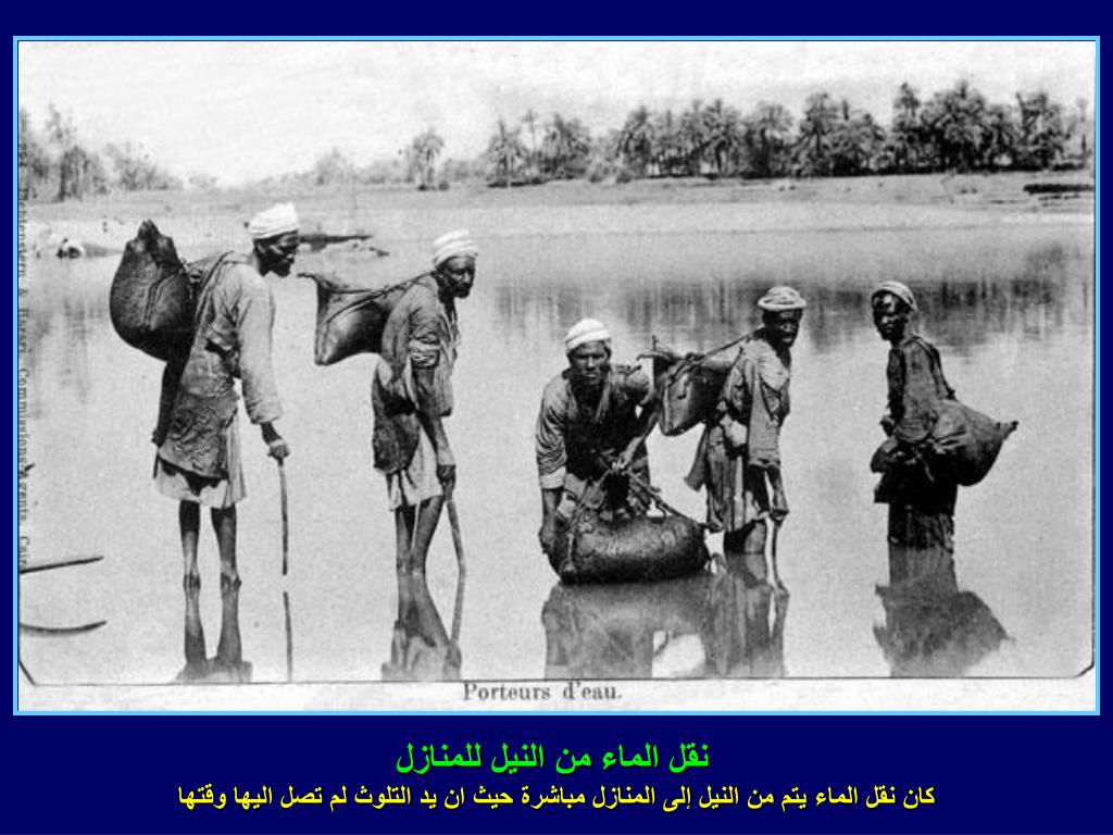نقل الماء من النيل للمنازل كان نقل الماء يتم من النيل إلى المنازل مباشرة حيث ان يد التلوث لم تصل اليها وقتها