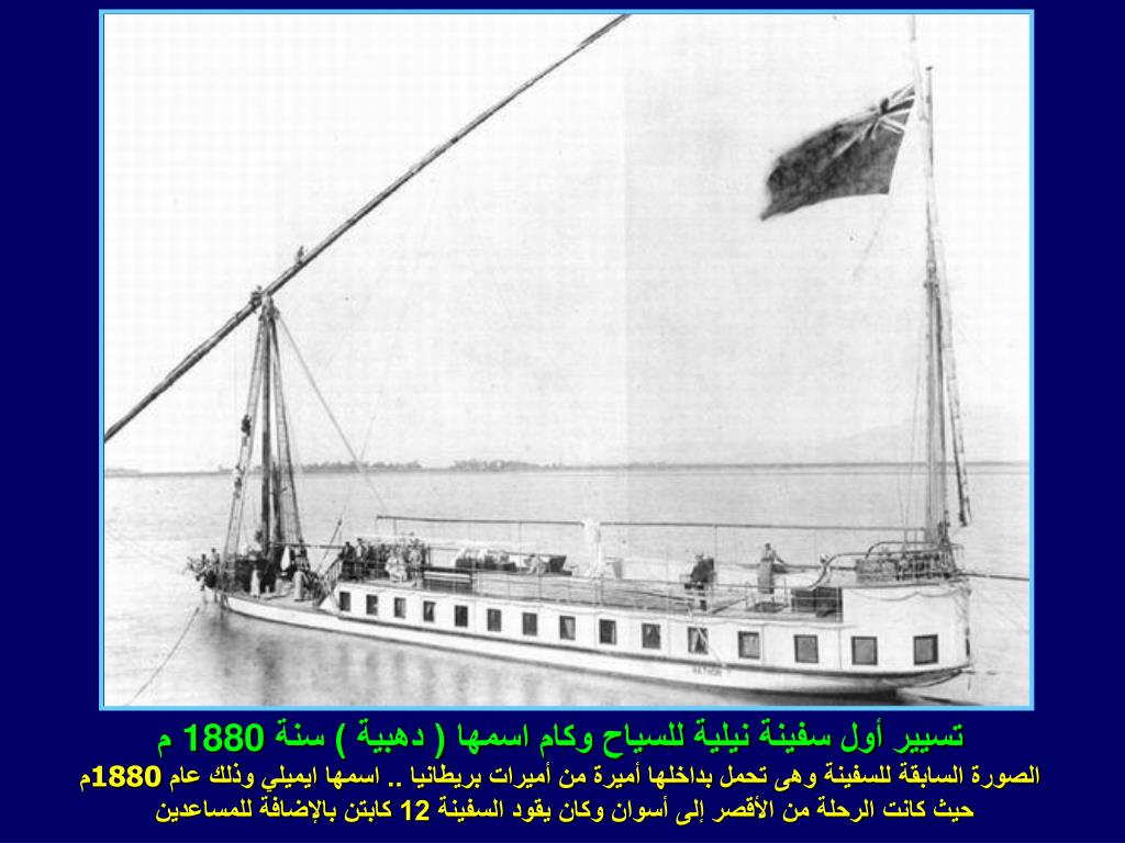 تسيير أول سفينة نيلية للسياح وكام اسمها ( دهبية ) سنة 1880 م الصورة السابقة للسفينة وهى تحمل بداخلها أميرة من أميرات بريطانيا .. اسمها ايميلي وذلك عام 1880م حيث كانت الرحلة من الأقصر إلى أسوان وكان يقود السفينة 12 كابتن بالإضافة للمساعدين