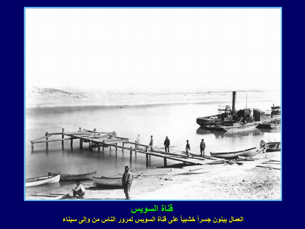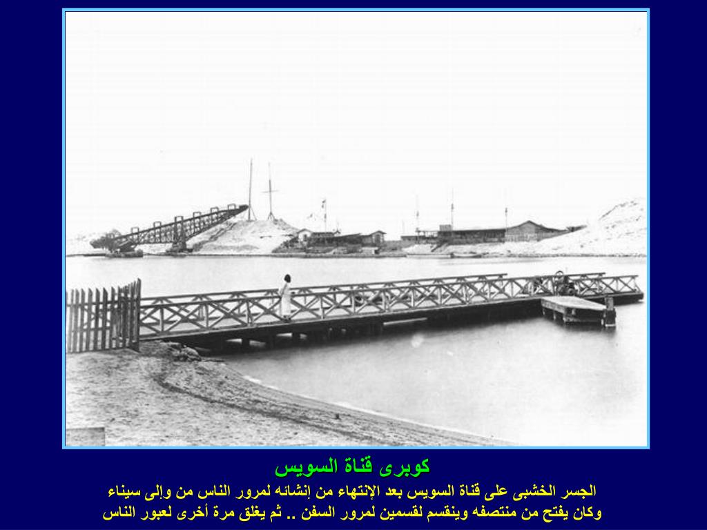 كوبرى قناة السويس الجسر الخشبى على قناة السويس بعد الإنتهاء من إنشائه لمرور الناس من وإلى سيناء وكان يفتح من منتصفه وينقسم لقسمين لمرور السفن .. ثم يغلق مرة أخرى لعبور الناس