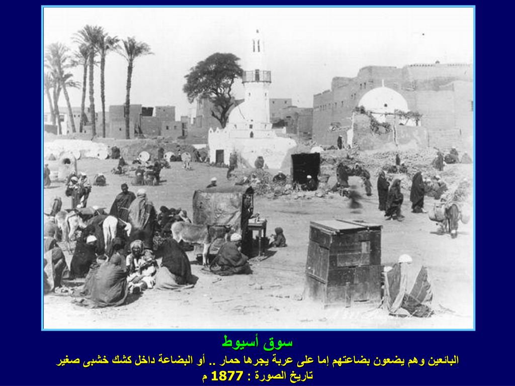 سوق أسيوط البائعين وهم يضعون بضاعتهم إما على عربة يجرها حمار .. أو البضاعة داخل كشك خشبى صغيرتاريخ الصورة : 1877 م
