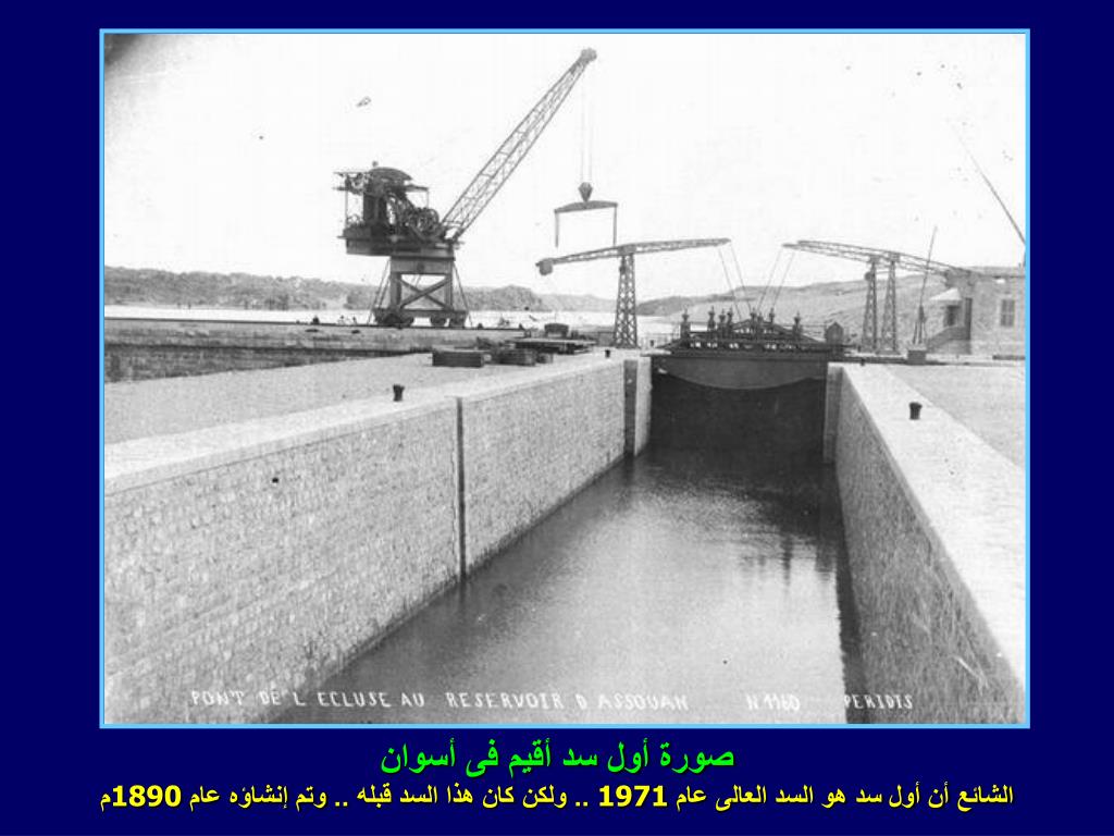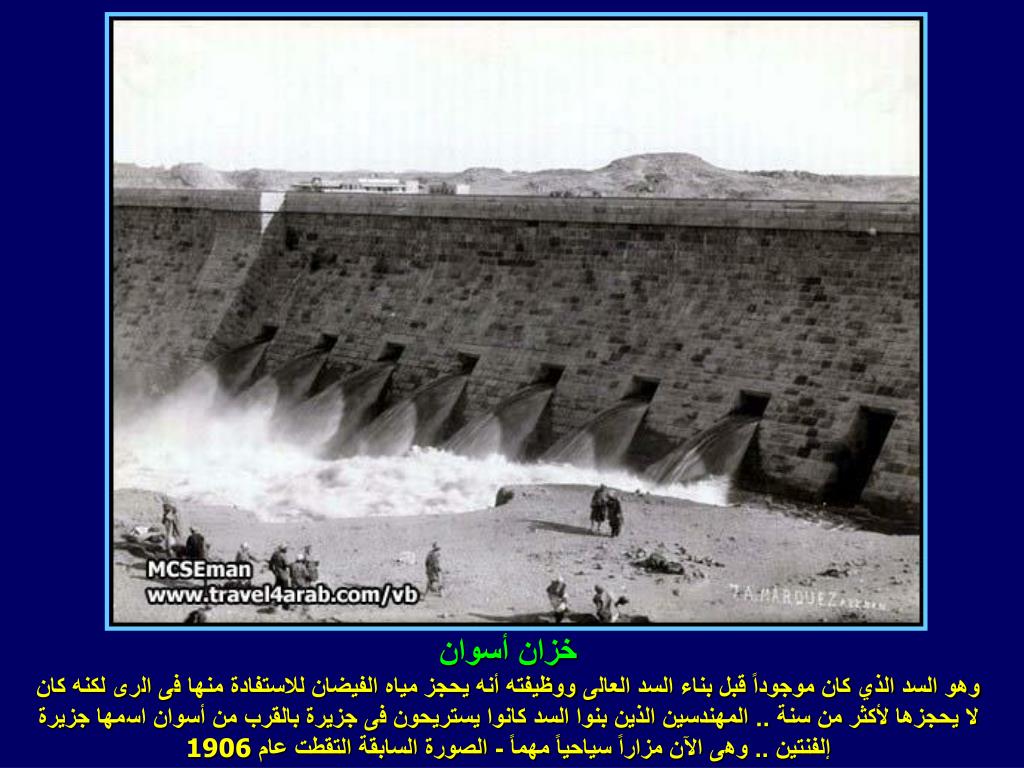 خزان أسوان وهو السد الذي كان موجوداً قبل بناء السد العالى ووظيفته أنه يحجز مياه الفيضان للاستفادة منها فى الرى لكنه كان لا يحجزها لأكثر من سنة .. المهندسين الذين بنوا السد كانوا يستريحون فى جزيرة بالقرب من أسوان اسمها جزيرة إلفنتين .. وهى الآن مزاراً سياحياً مهماً - الصورة السابقة التقطت عام 1906