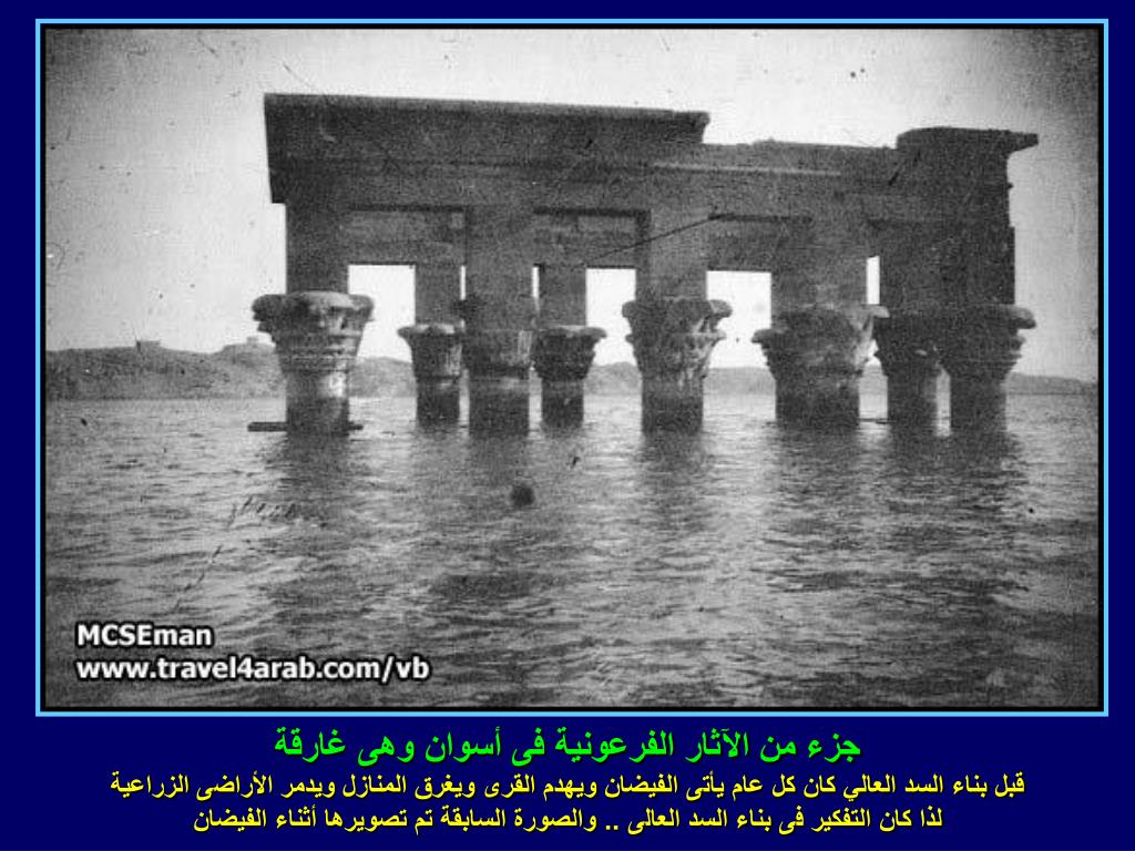 جزء من الآثار الفرعونية فى أسوان وهى غارقة قبل بناء السد العالي كان كل عام يأتى الفيضان ويهدم القرى ويغرق المنازل ويدمر الأراضى الزراعية لذا كان التفكير فى بناء السد العالى .. والصورة السابقة تم تصويرها أثناء الفيضان