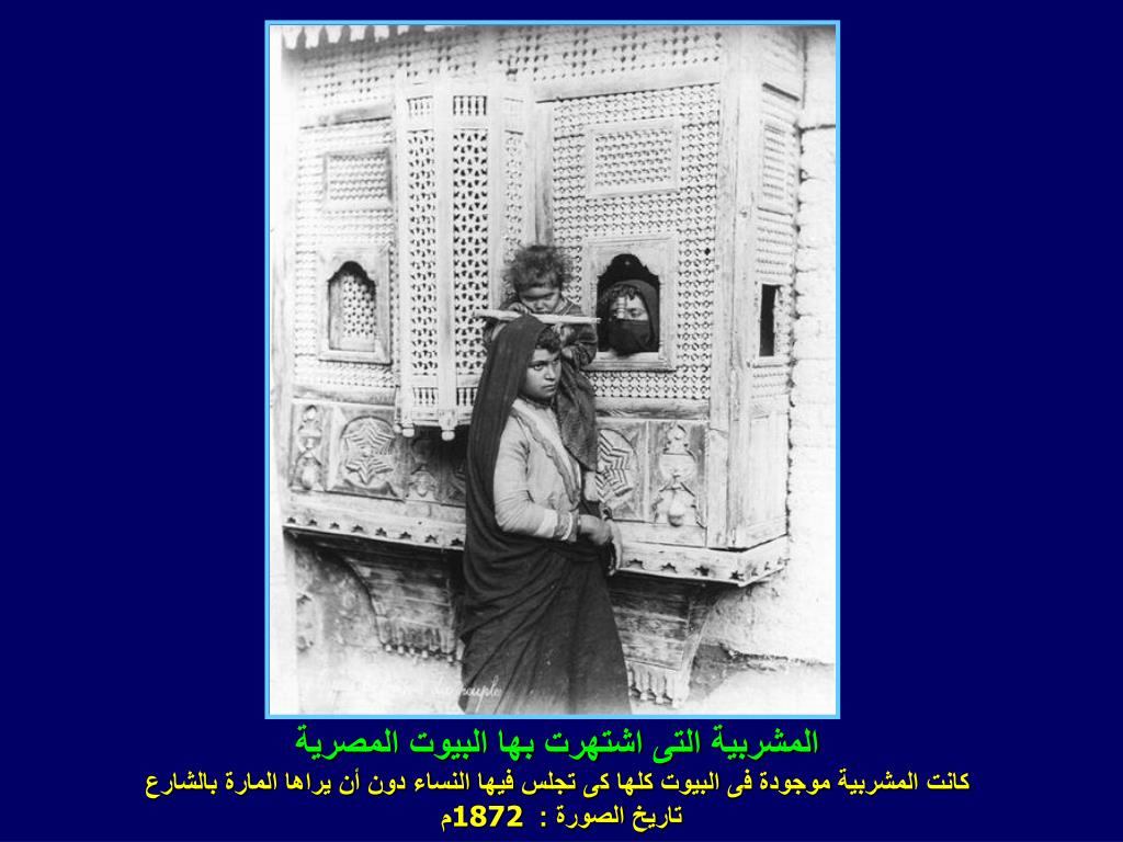 المشربية التى اشتهرت بها البيوت المصرية كانت المشربية موجودة فى البيوت كلها كى تجلس فيها النساء دون أن يراها المارة بالشارع تاريخ الصورة : 1872م