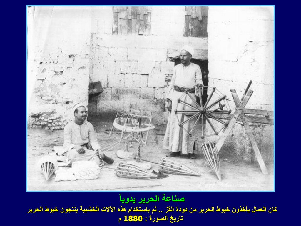 صناعة الحرير يدوياً كان العمال يأخذون خيوط الحرير من دودة القز .. ثمباستخدام هذه الآلات الخشبية ينتجون خيوط الحرير تاريخ الصورة : 1880 م