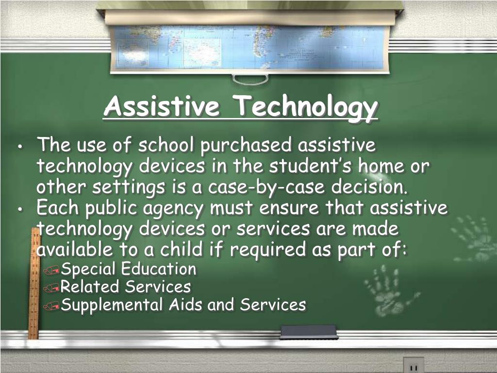 Assistive Technology • The use of school purchased assistive technology devices in the student’s home or other settings is a case-by-case decision. • Each public agency must ensure that assistive technology devices or services are made available to a child if required as part of: • Special Education • Related Services • Supplemental Aids and Services