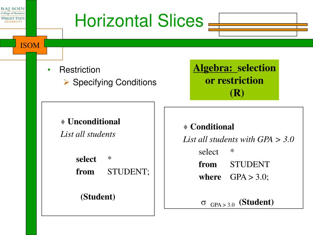 Horizontal Slices Algebra: selection or restriction (R) • Restriction • Specifying Conditions • Unconditional • List all students • select * • from STUDENT; • (Student) • Conditional • List all students with GPA > 3.0 • select * • from STUDENT • where GPA > 3.0; • GPA > 3.0(Student)