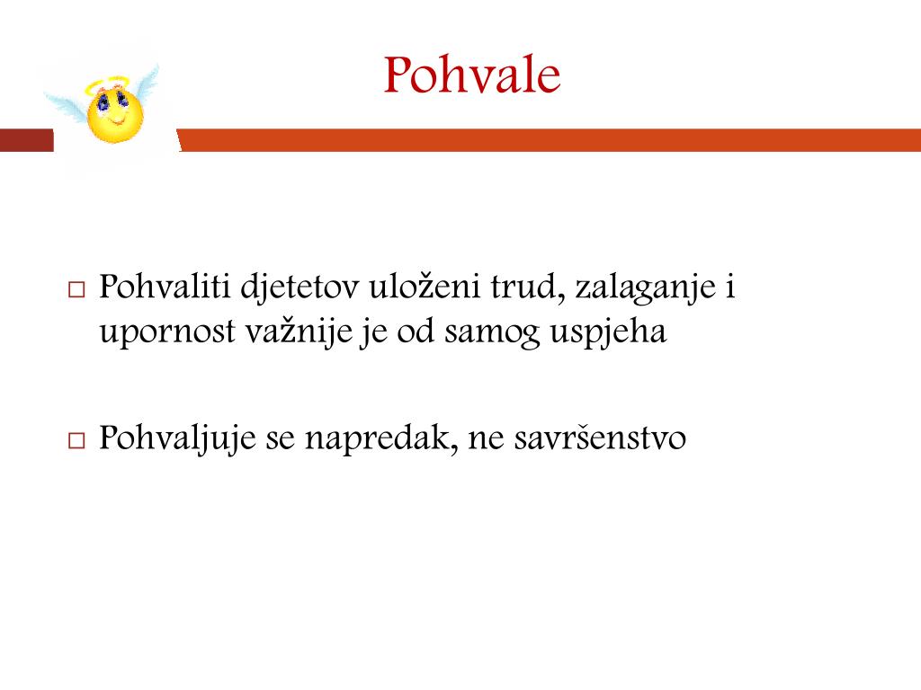 Pohvale • Pohvaliti djetetov uloženi trud, zalaganje i upornost važnije je od samog uspjeha • Pohvaljuje se napredak, ne savršenstvo