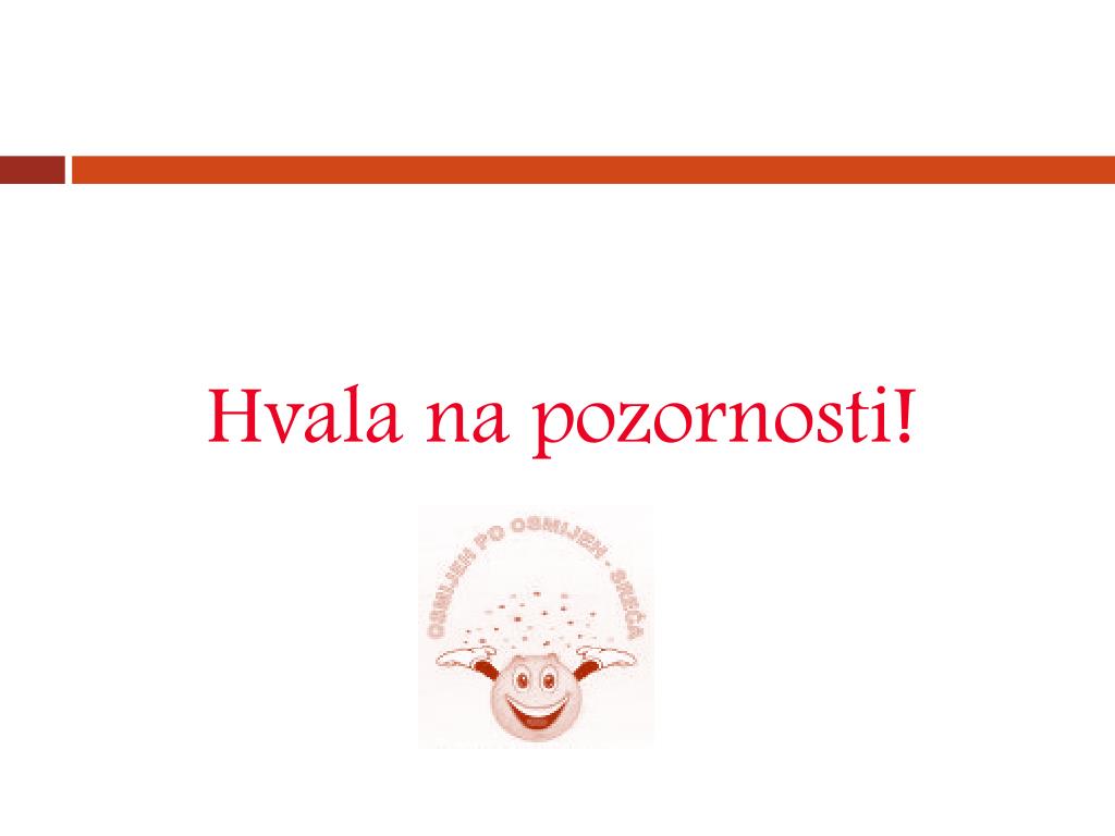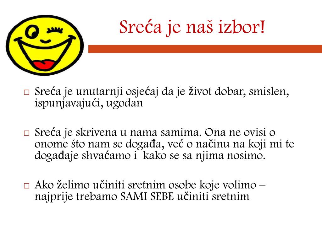 Sreća je naš izbor! • Sreća je unutarnji osjećaj da je život dobar, smislen, ispunjavajući, ugodan • Sreća je skrivena u nama samima. Ona ne ovisi o onome što nam se događa, već o načinu na koji mi te događaje shvaćamo i kako se sa njima nosimo. • Ako želimo učiniti sretnim osobe koje volimo – najprije trebamo SAMI SEBE učiniti sretnim