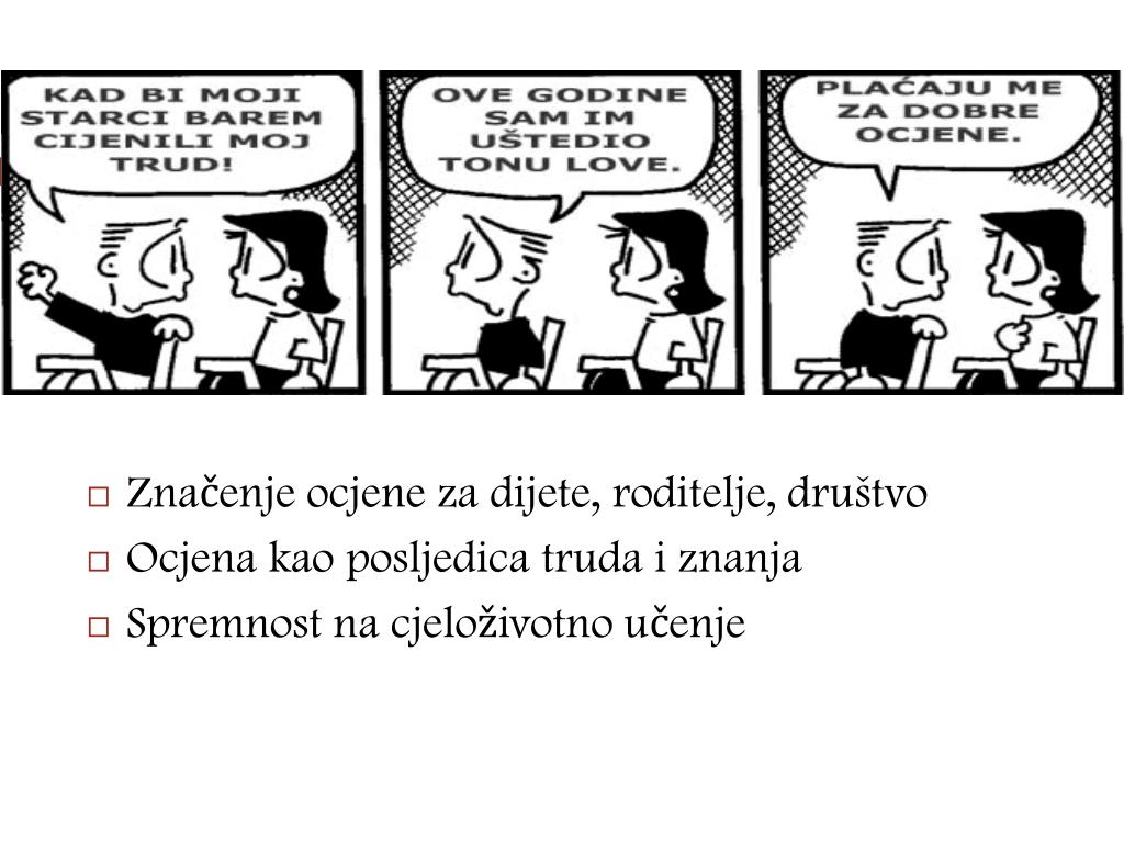 Značenje ocjene za dijete, roditelje, društvo • Ocjena kao posljedica truda i znanja • Spremnost na cjeloživotno učenje