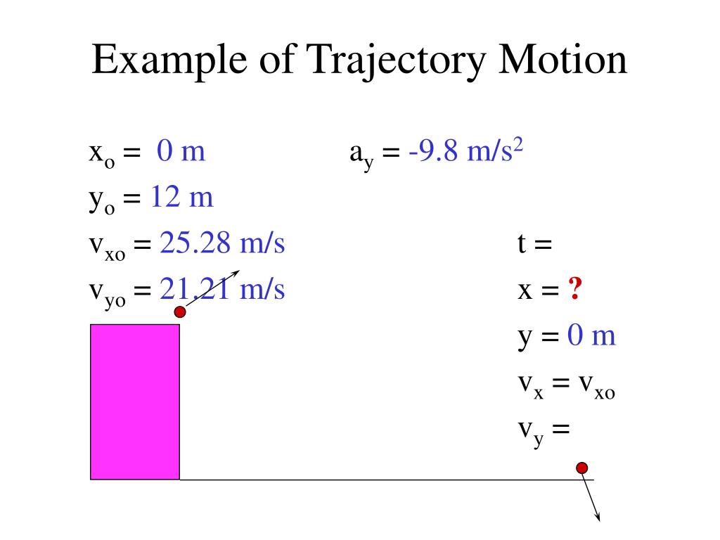 Example of Trajectory Motion xo = 0 m ay = -9.8 m/s2 yo = 12 m vxo = t = vyo = x = y = vx = vxo vy =