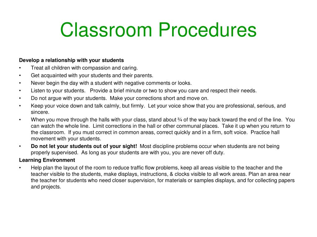 Classroom Procedures Develop a relationship with your students Treat all children with compassion and caring. Get acquainted with your students and their parents. Never begin the day with a student with negative comments or looks. Listen to your students. Provide a brief minute or two to show you care and respect their needs. Do not argue with your students. Make your corrections short and move on. Keep your voice down and talk calmly, but firmly. Let your voice show that you are professional, serious, and sincere. When you move through the halls with your class, stand about ¾ of the way back toward the end of the line. You can watch the whole line. Limit corrections in the hall or other communal places. Take it up when you return to the classroom. If you must correct in common areas, correct quickly and in a firm, soft voice. Practice hall movement with your students. Do not let your students out of your sight! Most discipline problems occur when students are not being properly supervised. As long as your students are with you, you are never off duty. Learning Environment Help plan the layout of the room to reduce traffic flow problems, keep all areas visible to the teacher and the teacher visible to the students, make displays, instructions, & clocks visible to all work areas. Plan an area near the teacher for students who need closer supervision, for materials or samples displays, and for collecting papers and projects.