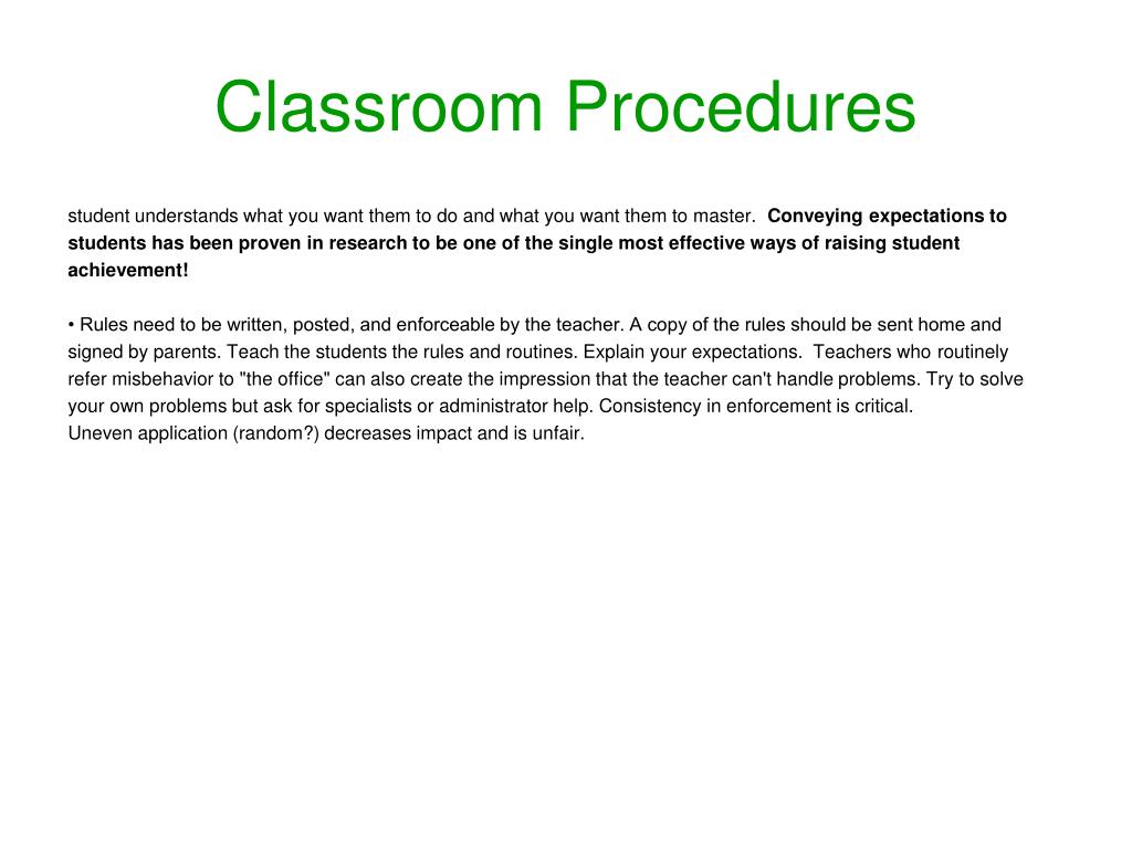 Classroom Procedures student understands what you want them to do and what you want them to master. Conveying expectations to students has been proven in research to be one of the single most effective ways of raising student achievement! • Rules need to be written, posted, and enforceable by the teacher. A copy of the rules should be sent home and signed by parents. Teach the students the rules and routines. Explain your expectations. Teachers who routinely refer misbehavior to "the office" can also create the impression that the teacher can't handle problems. Try to solve your own problems but ask for specialists or administrator help. Consistency in enforcement is critical. Uneven application (random?) decreases impact and is unfair.