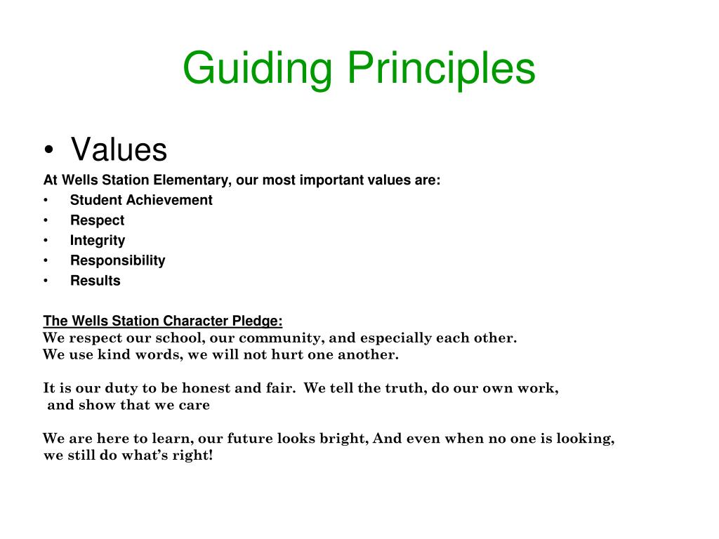 Guiding Principles • Values At Wells Station Elementary, our most important values are: • Student Achievement • Respect • Integrity • Responsibility • Results The Wells Station Character Pledge: We respect our school, our community, and especially each other. We use kind words, we will not hurt one another. It is our duty to be honest and fair. We tell the truth, do our own work, and show that we care We are here to learn, our future looks bright, And even when no one is looking, we still do what’s right!