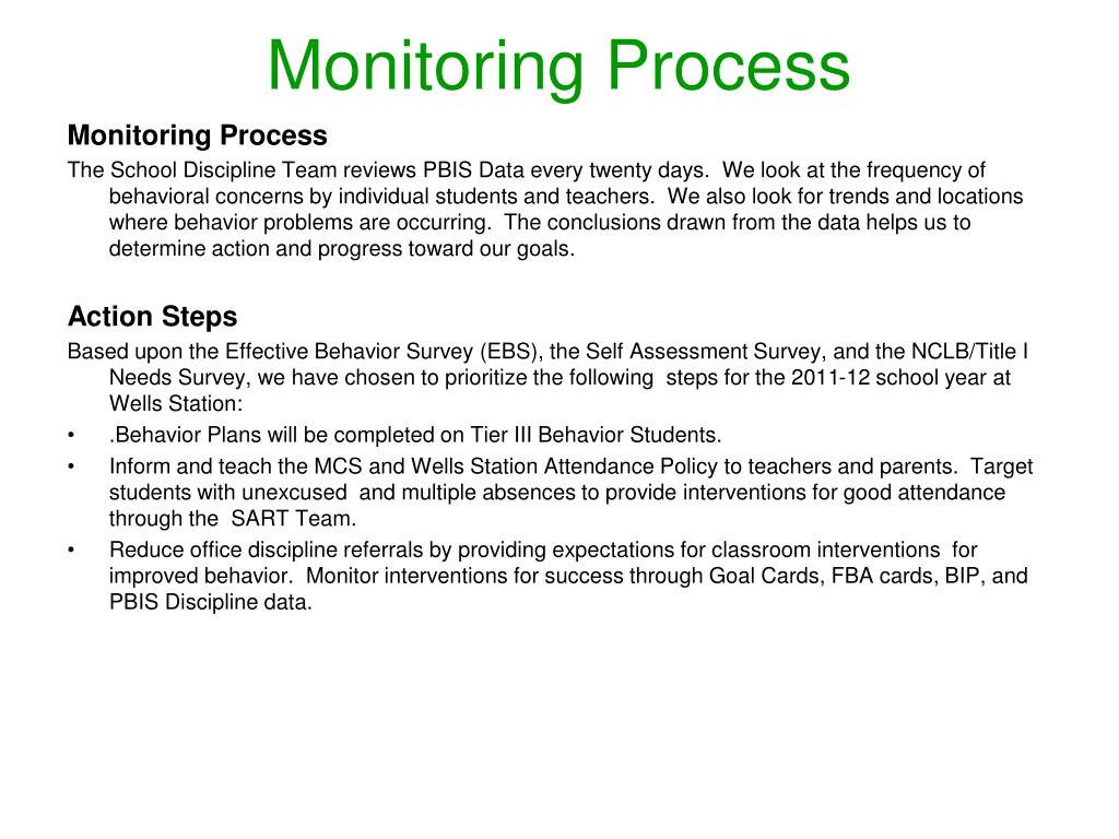 Monitoring Process Monitoring Process The School Discipline Team reviews PBIS Data every twenty days. We look at the frequency of behavioral concerns by individual students and teachers. We also look for trends and locations where behavior problems are occurring. The conclusions drawn from the data helps us to determine action and progress toward our goals. Action Steps Based upon the Effective Behavior Survey (EBS), the Self Assessment Survey, and the NCLB/Title I Needs Survey, we have chosen to prioritize the following steps for the 2011-12 school year at Wells Station: .Behavior Plans will be completed on Tier III Behavior Students. Inform and teach the MCS and Wells Station Attendance Policy to teachers and parents. Target students with unexcused and multiple absences to provide interventions for good attendance through the SART Team. Reduce office discipline referrals by providing expectations for classroom interventions for improved behavior. Monitor interventions for success through Goal Cards, FBA cards, BIP, and PBIS Discipline data.
