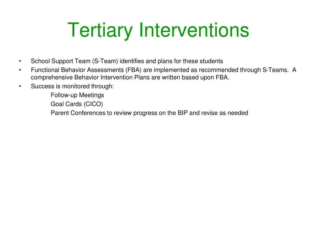 Tertiary Interventions School Support Team (S-Team) identifies and plans for these students Functional Behavior Assessments (FBA) are implemented as recommended through S-Teams. A comprehensive Behavior Intervention Plans are written based upon FBA. Success is monitored through: Follow-up Meetings Goal Cards (CICO) Parent Conferences to review progress on the BIP and revise as needed