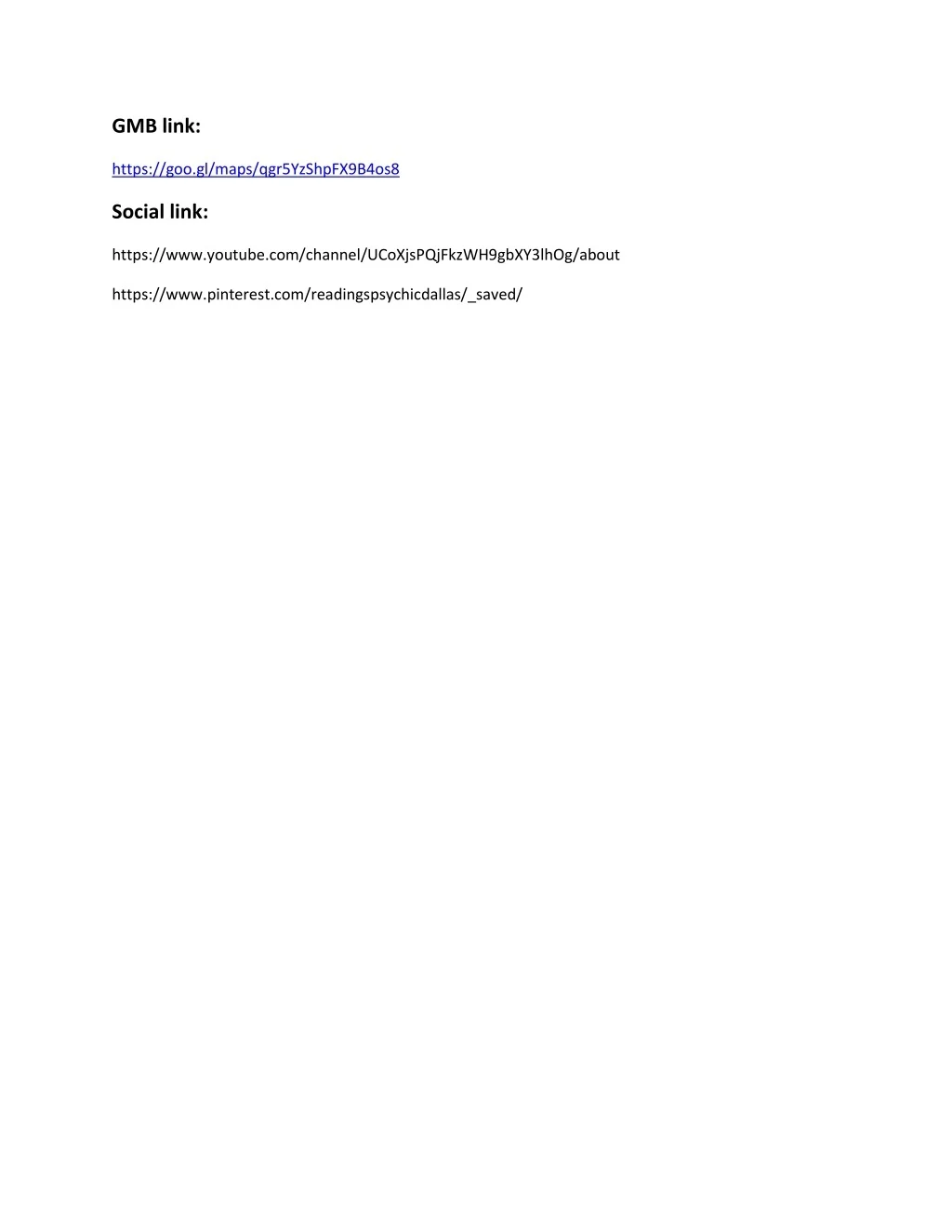 GMB link: https://goo.gl/maps/qgr5YzShpFX9B4os8 Social link: https://www.youtube.com/channel/UCoXjsPQjFkzWH9gbXY3lhOg/about https://www.pinterest.com/readingspsychicdallas/_saved/