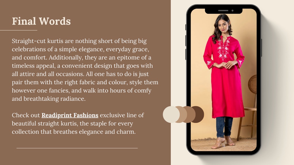 Final Words Straight-cut kurtis are nothing short of being big celebrations of a simple elegance, everyday grace, and comfort. Additionally, they are an epitome of a timeless appeal, a convenient design that goes with all attire and all occasions. All one has to do is just pair them with the right fabric and colour, style them however one fancies, and walk into hours of comfy and breathtaking radiance. Check out Readiprint Fashions exclusive line of beautiful straight kurtis, the staple for every collection that breathes elegance and charm.