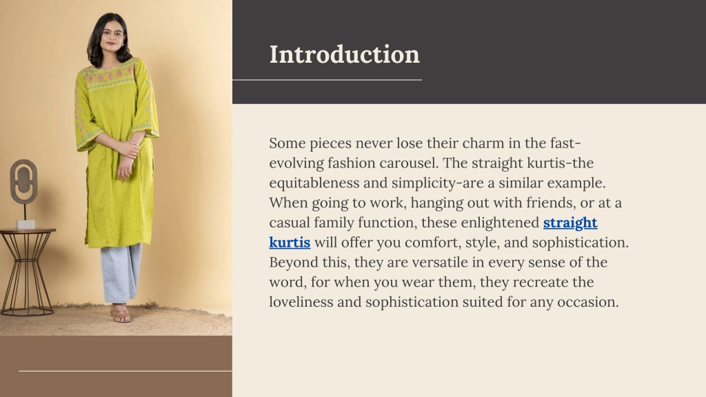 Introduction Some pieces never lose their charm in the fast- evolving fashion carousel. The straight kurtis-the equitableness and simplicity-are a similar example. When going to work, hanging out with friends, or at a casual family function, these enlightened straight kurtis will offer you comfort, style, and sophistication. Beyond this, they are versatile in every sense of the word, for when you wear them, they recreate the loveliness and sophistication suited for any occasion.