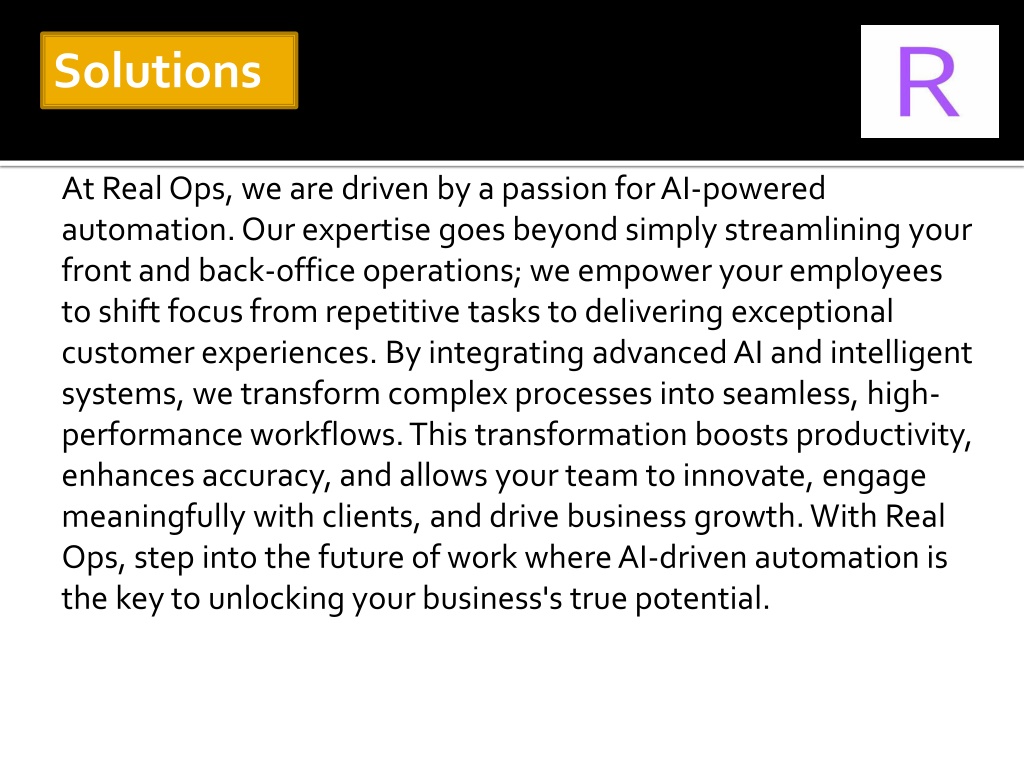 Solutions At Real Ops, we are driven by a passion for AI-powered automation. Our expertise goes beyond simply streamlining your front and back-office operations; we empower your employees to shift focus from repetitive tasks to delivering exceptional customer experiences. By integrating advanced AI and intelligent systems, we transform complex processes into seamless, high-performance workflows. This transformation boosts productivity, enhances accuracy, and allows your team to innovate, engage meaningfully with clients, and drive business growth. With Real Ops, step into the future of work where AI-driven automation is the key to unlocking your business's true potential.