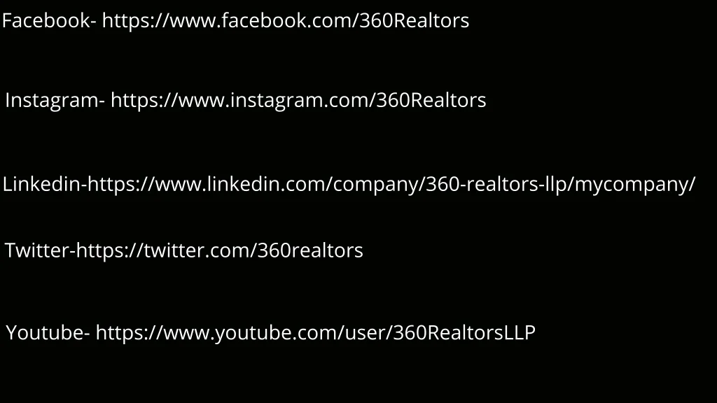 Facebook- https://www.facebook.com/360Realtors Instagram- https://www.instagram.com/360Realtors Linkedin-https://www.linkedin.com/company/360-realtors-llp/mycompany/ Twitter-https://twitter.com/360realtors Youtube- https://www.youtube.com/user/360RealtorsLLP