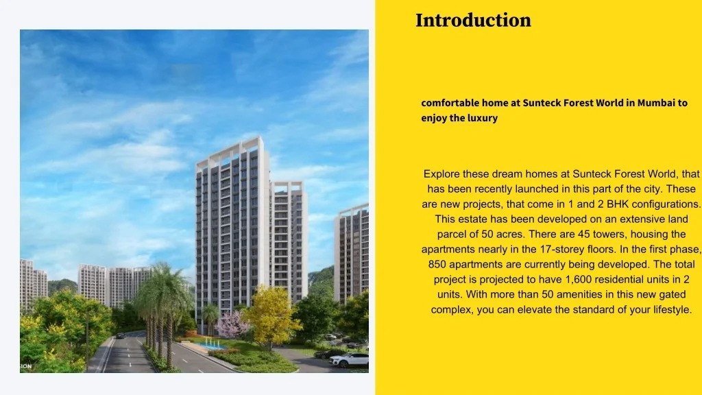 Introduction comfortable home at Sunteck Forest World in Mumbai to enjoy the luxury Explore these dream homes at Sunteck Forest World, that has been recently launched in this part of the city. These are new projects, that come in 1 and 2 BHK configurations. This estate has been developed on an extensive land parcel of 50 acres. There are 45 towers, housing the apartments nearly in the 17-storey floors. In the first phase, 850 apartments are currently being developed. The total project is projected to have 1,600 residential units in 2 units. With more than 50 amenities in this new gated complex, you can elevate the standard of your lifestyle.