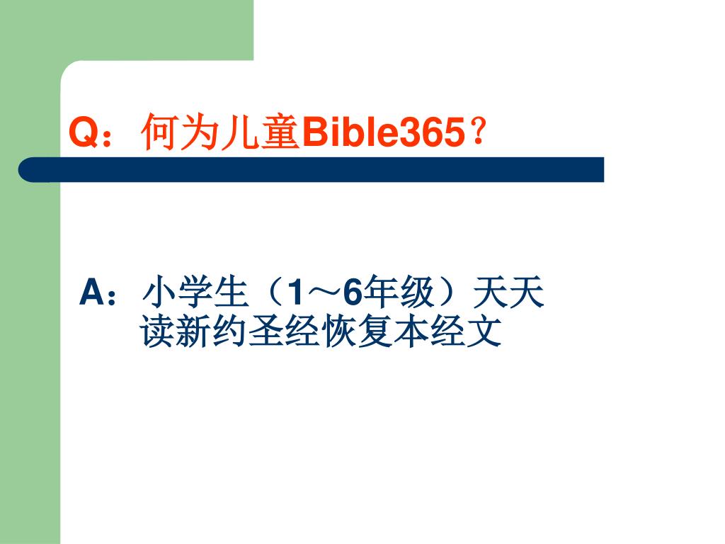 儿童 Bible365 http://www.MyBible365.org 二〇〇九年七月二十六日. 回归圣经!. 儿童 Bible365 负担. 回归主自己!. A :小学生( 1 ~ 6 年级)天天 读新约圣经恢复本经文. Q :何为儿童 Bible365 ?. Q :儿童也可以读圣经吗?. “当 孩子 还 在 襁褓 中 时 ,我 们 家就常常播放 儿童 诗歌 。 ”