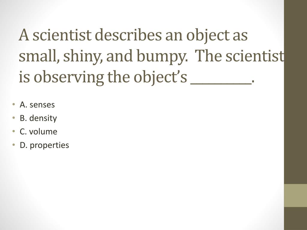 A scientist describes an object as small, shiny, and bumpy. The scientist is observing the object’s __________. • A. senses • B. density • C. volume • D. properties
