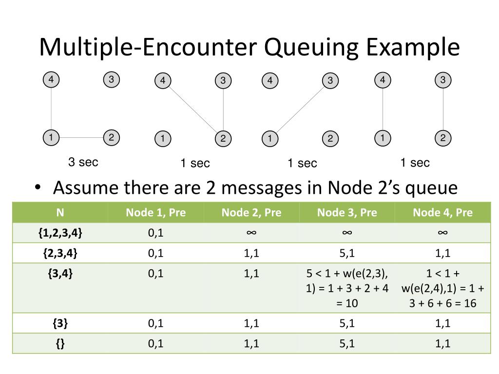 Multiple-Encounter Queuing Example • Assume there are 2 messages in Node 2’s queue