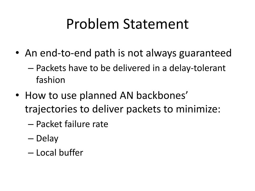 Problem Statement • An end-to-end path is not always guaranteed • Packets have to be delivered in a delay-tolerant fashion • How to use planned AN backbones’ trajectories to deliver packets to minimize: • Packet failure rate • Delay • Local buffer