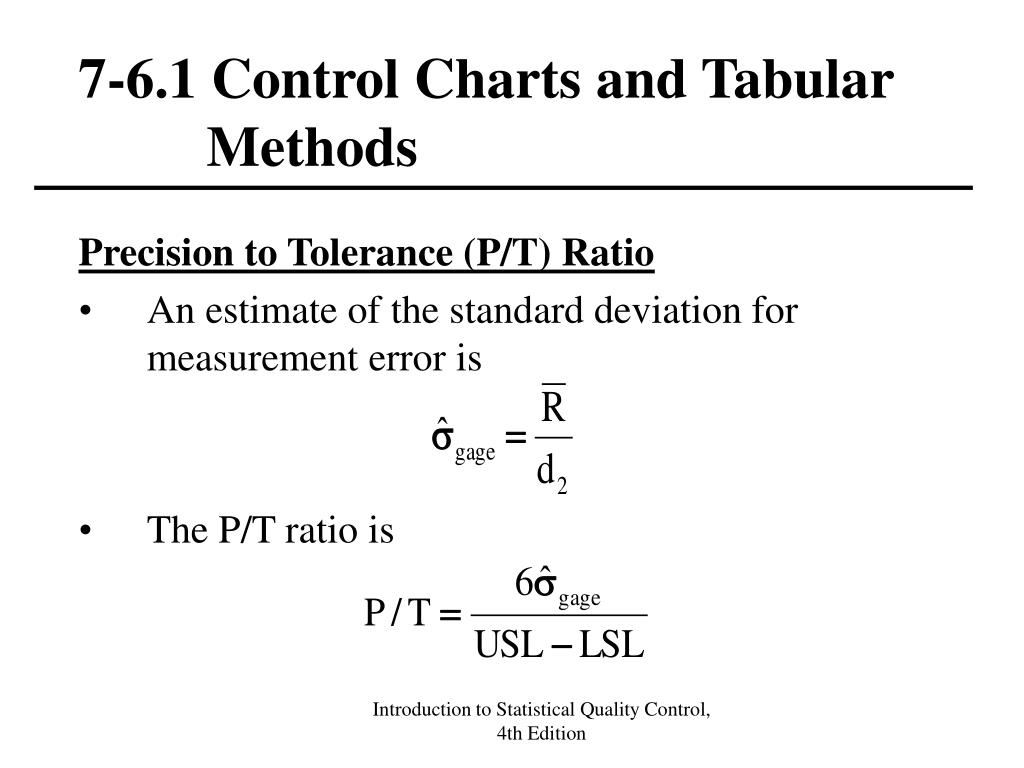 7-6.1 Control Charts and Tabular Methods Precision to Tolerance (P/T) Ratio • An estimate of the standard deviation for measurement error is • The P/T ratio is Introduction to Statistical Quality Control, 4th Edition