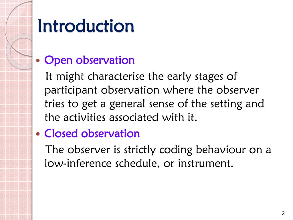 Introduction • Open observation It might characterise the early stages of participant observation where the observer tries to get a general sense of the setting and the activities associated with it. • Closed observation The observer is strictly coding behaviour on a low-inference schedule, or instrument.