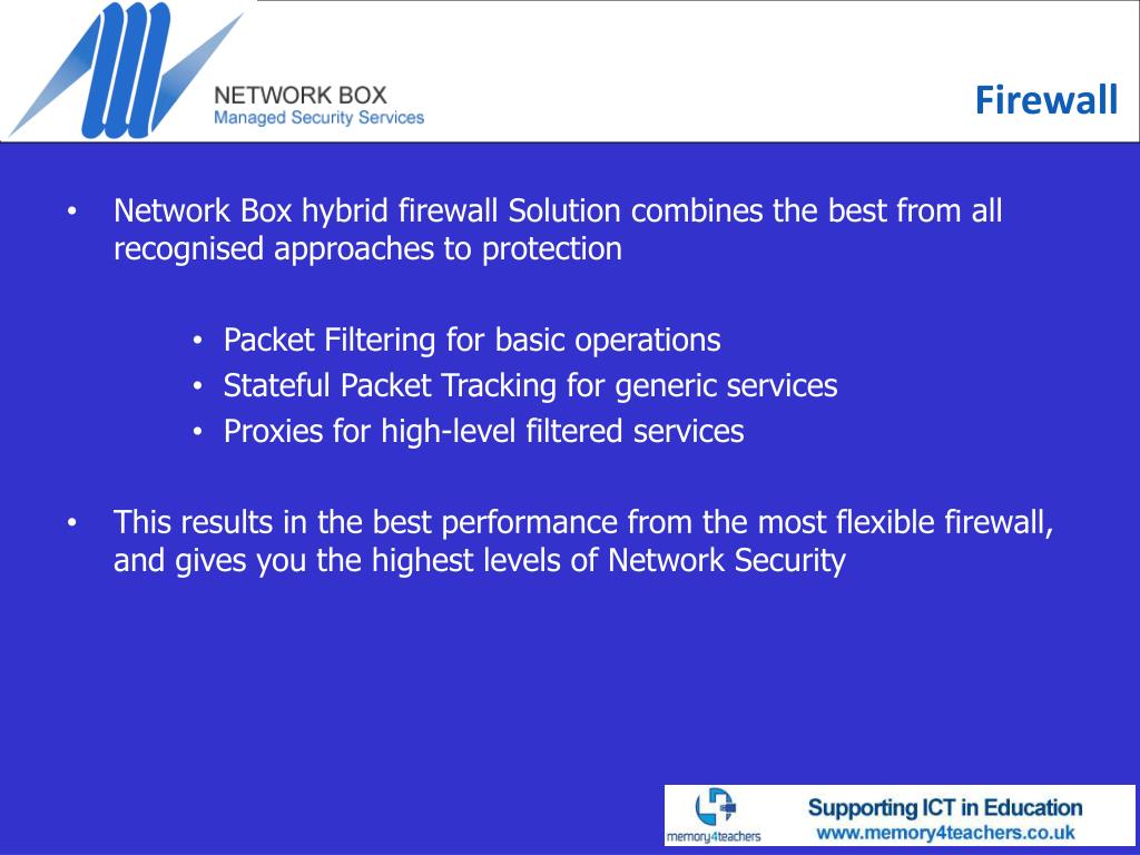 Network Box hybrid firewall Solution combines the best from all recognised approaches to protection Packet Filtering for basic operations Stateful Packet Tracking for generic services Proxies for high-level filtered services This results in the best performance from the most flexible firewall, and gives you the highest levels of Network Security Firewall