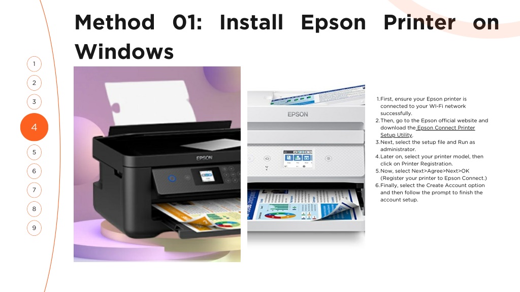Method 01: Install Epson Printer on Windows 1 2 1.First, ensure your Epson printer is connected to your WI-Fi network successfully. 2.Then, go to the Epson official website and download the Epson Connect Printer Setup Utility. 3.Next, select the setup file and Run as administrator. 4.Later on, select your printer model, then click on Printer Registration. 5.Now, select Next>Agree>Next>OK (Register your printer to Epson Connect.) 6.Finally, select the Create Account option and then follow the prompt to finish the account setup. 3 4 5 6 7 8 9