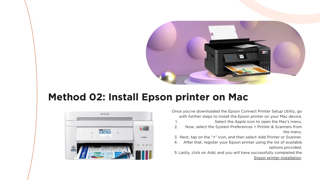 Method 02: Install Epson printer on Mac Once you've downloaded the Epson Connect Printer Setup Utility, go with further steps to install the Epson printer on your Mac device. 1. Select the Apple icon to open the Mac's menu. 2. Now, select the System Preferences > Printer & Scanners from the menu. 3. Next, tap on the "+" icon, and then select Add Printer or Scanner. 4. After that, register your Epson printer using the list of available options provided. 5. Lastly, click on Add, and you will have successfully completed the Epson printer installation.