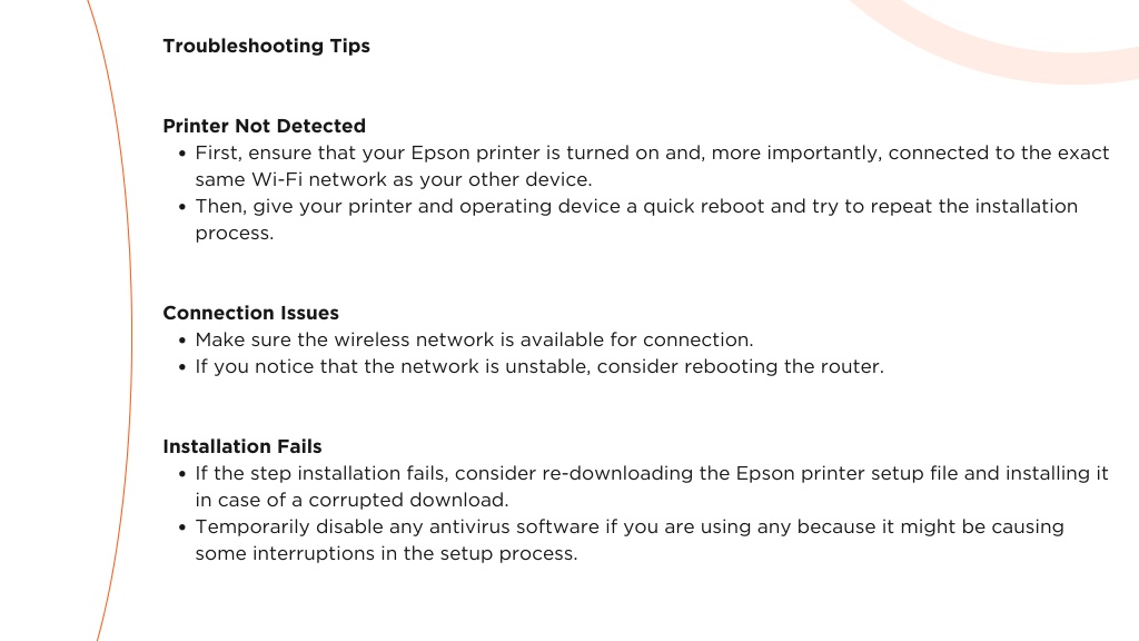 Troubleshooting Tips Printer Not Detected First, ensure that your Epson printer is turned on and, more importantly, connected to the exact same Wi-Fi network as your other device. Then, give your printer and operating device a quick reboot and try to repeat the installation process. Connection Issues Make sure the wireless network is available for connection. If you notice that the network is unstable, consider rebooting the router. Installation Fails If the step installation fails, consider re-downloading the Epson printer setup file and installing it in case of a corrupted download. Temporarily disable any antivirus software if you are using any because it might be causing some interruptions in the setup process.